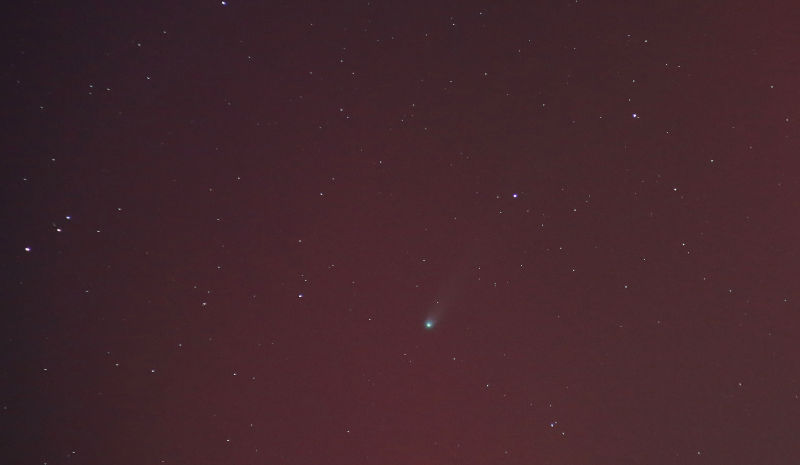 Bei 200 mm Brennweite ist der Komet besser erkennbar und das Rot des Polarlichts ist noch da. Komet und Polarlicht in einem Bild dürfte ein Novum für das Altenburger Land sein.