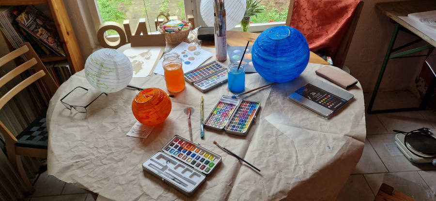 Zuvor begann 14 Uhr in der Laube des nahegelegenen Kunstgarten ein begleitendes künstlerisches Programm. Papierlaternen wurden zu Planeten für einen zeitweiligen Planetenweg bemalt.