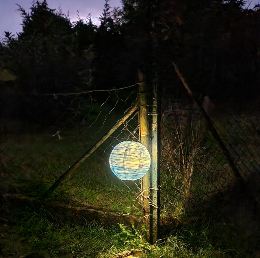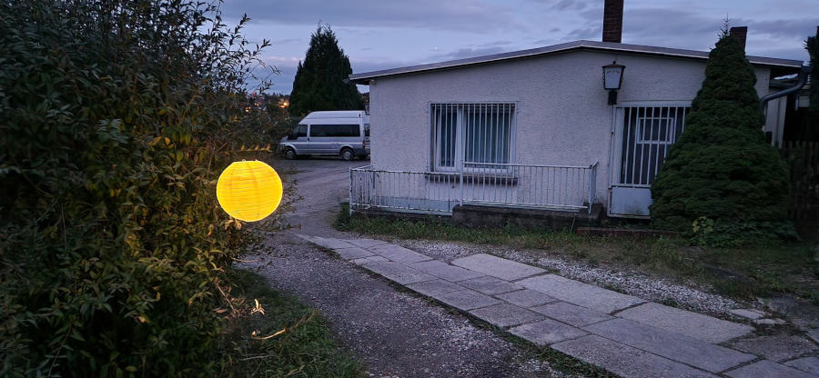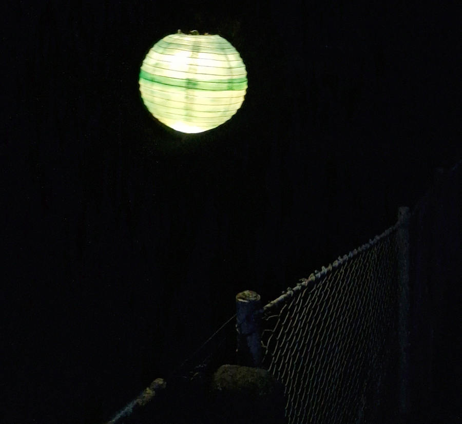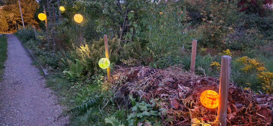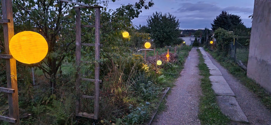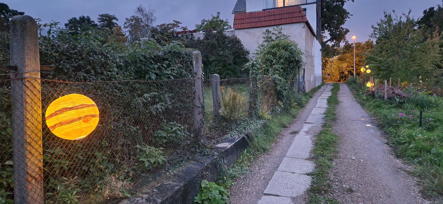 Abends führte der Planetenweg im Maßstab 1:25 Mrd vom Tor an der Schmöllschen Landstraße zum Tor am Großen Teich, wo sich der Sternengarten befindet. Hier ein Blick von der Sonne bis zum Saturn am Vereinsheim während des Aufbaus.