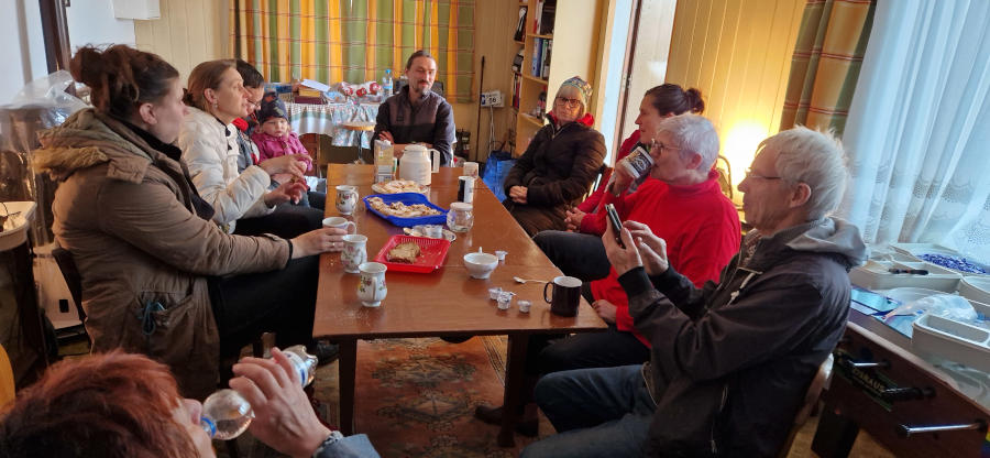 Eine gemischte Kaffeerunde aus Menschen, die am Astronomietag und an den Arbeiten am Glasmosaik teilnahmen, überbrückte die Zeit bis zur Beobachtung. Danke an Ursel für die Versorgung!