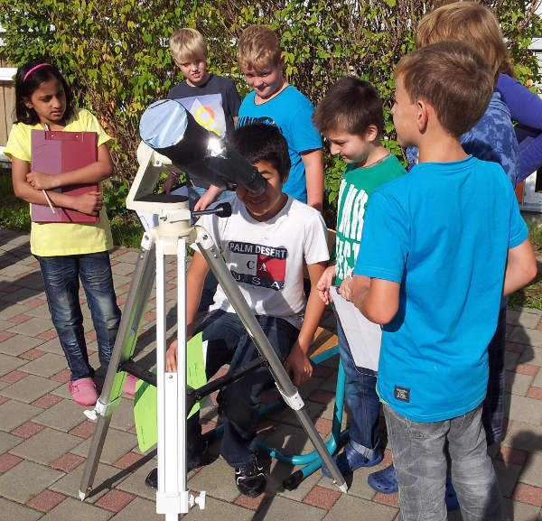 Bei Veranstaltungen mit Kindergruppen hatte sich ein Sonnenprojektor seit Jahren bewährt. Vorteile sind, dass mehrere Menschen gleichzeitig beobachten können, keine Nachfokussierungen auf unterschiedliche Augen nötig sind und dass die Sonnenflecken auf der Projektionsfläche mit einem Finger, Stab oder anderem Gegenstand gezeigt werden können.