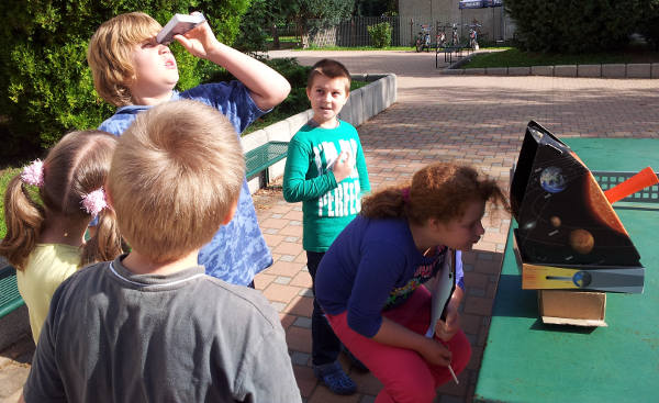 Als der Mond wieder sichtbar wurde, begann die Hofpause. Das Fernrohr blieb zunächst auf die Sonne ausgerichtet, damit auch andere Kinder die Sonnenflecken sehen konnten.