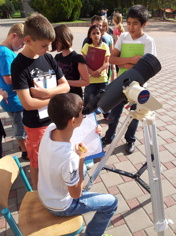 Weil das Bild im Projektor gespiegelt ist, sollten die Kinder am Fernrohr zeichnen. Im Eifer hielten sich einige nicht daran