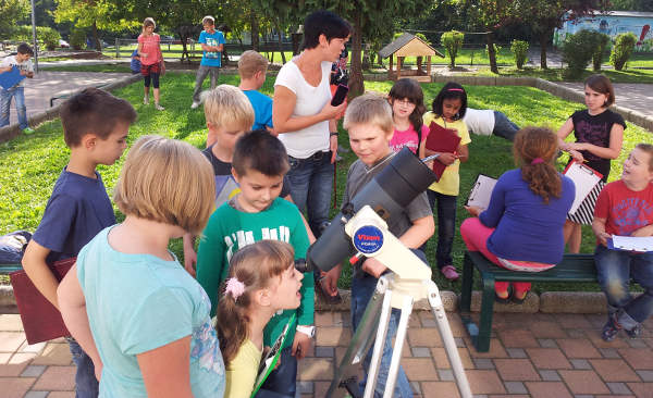 Die Lehrerin Sabine Meisel hatte vor zwei Jahren eine Veranstaltung mit dem AABS im Karolinum organisiert. Im Somer 2014 war sie an die Wilhelm-Busch-Grundschule in Altenburg Nord ausgeliehen und organisierte dort eine Astronomieveranstaltung für die Klasse 4b. Weil Frau Meisel eine Vertretung übernehmen musste, übernahm die Klassenlehrerin der 4b, Anja Kluge, die Betreuung.