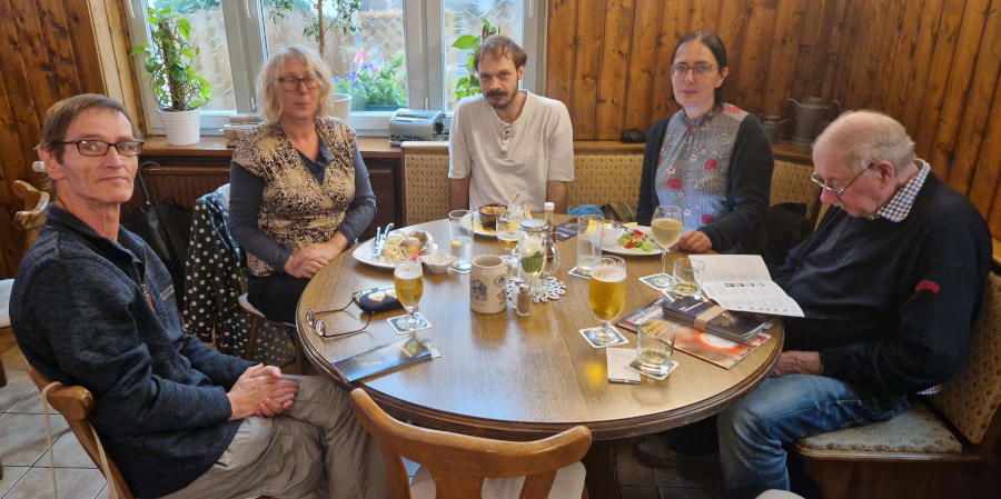 Eine zufällige Begegnung ergab sich bereits am zweiten August beim Astrostammtisch im Friesenheim. Gabi (2.v.l.), Markus und Helen kamen zufällig dazu. Das Kneipengespräch bot eine gute Gelegenheit zur inhaltlichen Vorbereitung des Interviews.