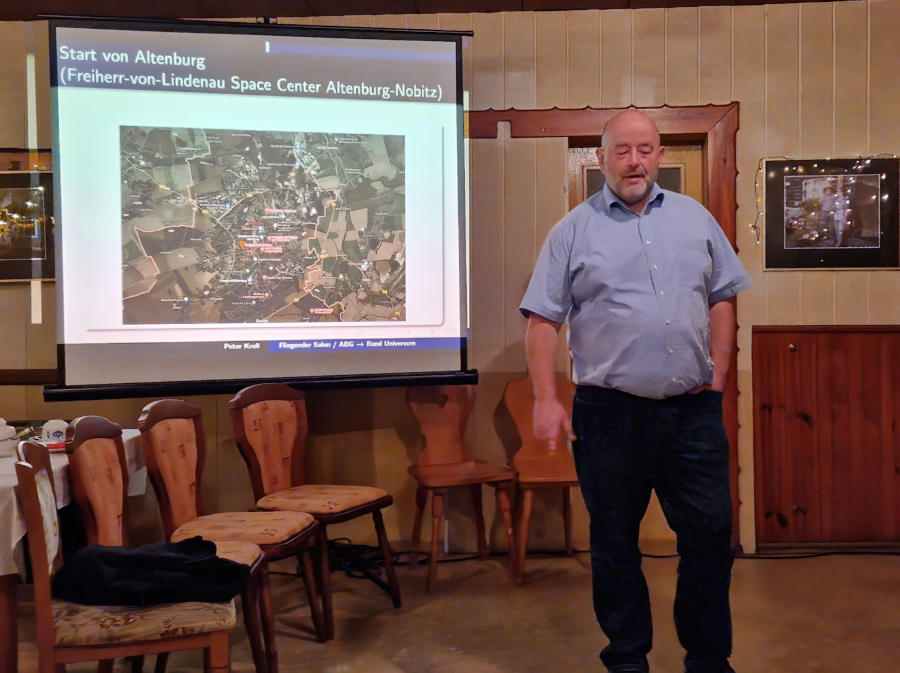 Kurz nach 19:15 begann Peter Kroll aus Sonneberg seinen Vortrag "Mit dem Fliegenden Salon der Kleingärten von Altenburg bis zum Rand des Universums". Mit viel Humor erläuterte er die Entfernungen im Universum mit Beginn am Flugplatz, den er zum "Freiherr von Lindenau Space Center Altenburg - Nobitz" deklariert hatte. Nach dem spannenden Vortrag klang das Fest nach 21 Uhr aus.