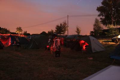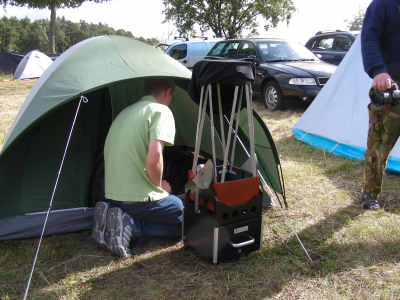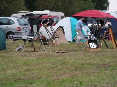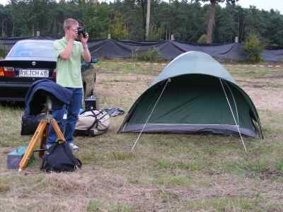 Am Freitag, d. 14.9.trafen wir gegen 18:00 MESZ auf dem Gelände bei Uebigau ein und schlugen unser Zelt bei diesem Schiefspiegler auf. Das Treffen hatte bereits am Donnerstag begonnen und so waren schon viele Zelte und Instrumente aufgebaut.