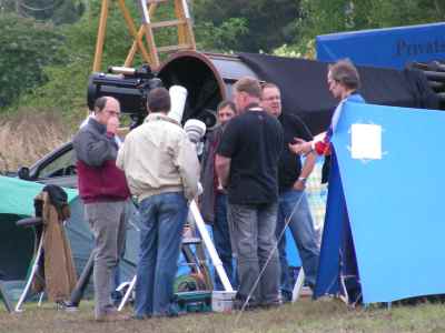 Es blieb noch Zeit bis zum Beobachtungsbeginn und man nutzte sie weiter zum Begutachten der Instrumente. Im Vergleich mit den Menschen sieht man erst, wie groß der 42"-Dobson ist.