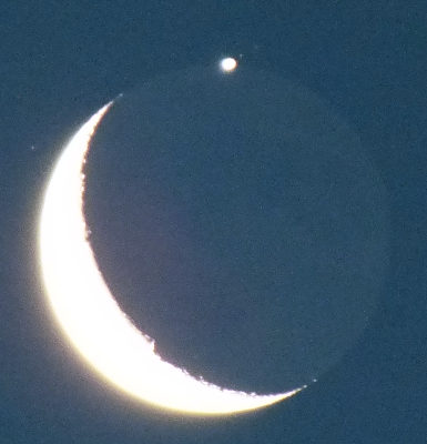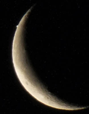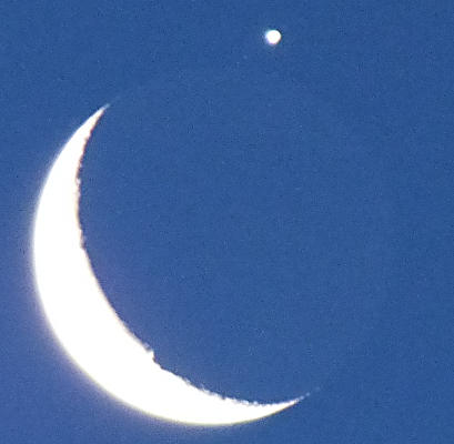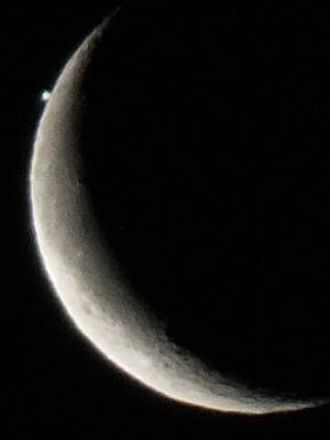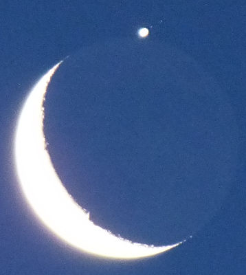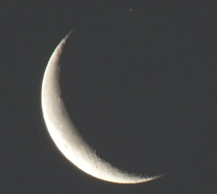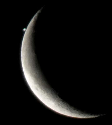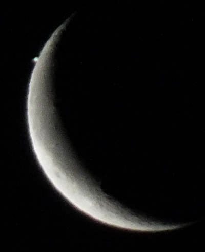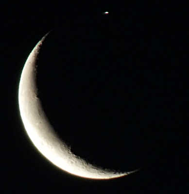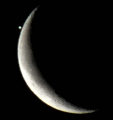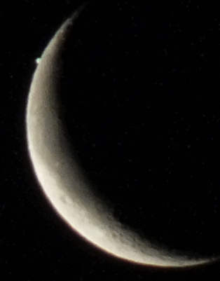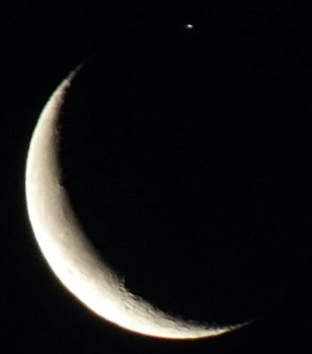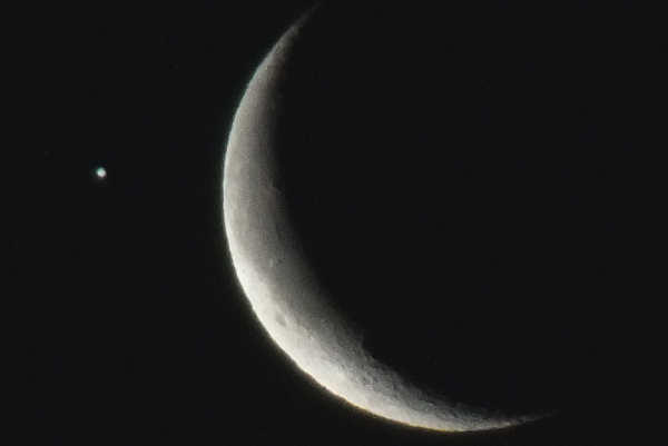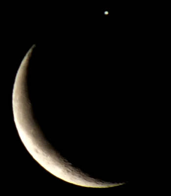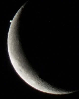 Das aschgraue Mondlicht ist noch erkennbar. Jupiter hat sich davon abgesetzt. Die beiden jupitermonde ganymed und Kallisto befinden sich noch hinter dem Erdmond.