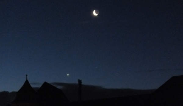 Während Jupiter hinter dem Mond stand, erhob sich Venus über die Dächer. Vor Austritt zog es wieder zu.