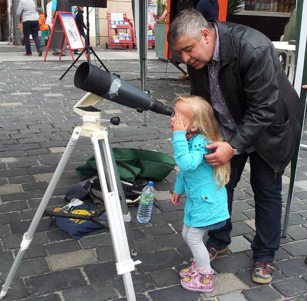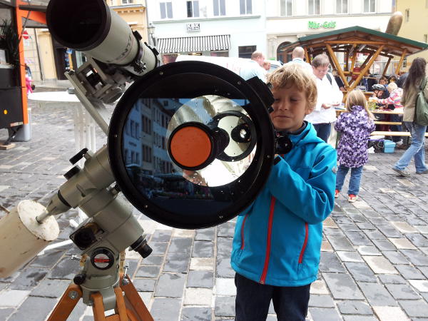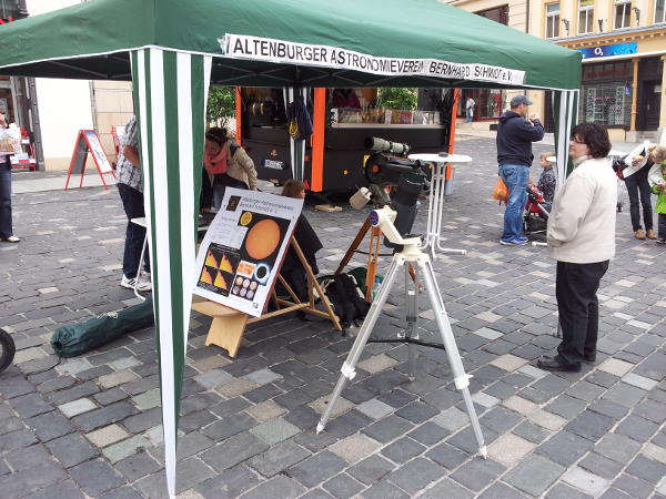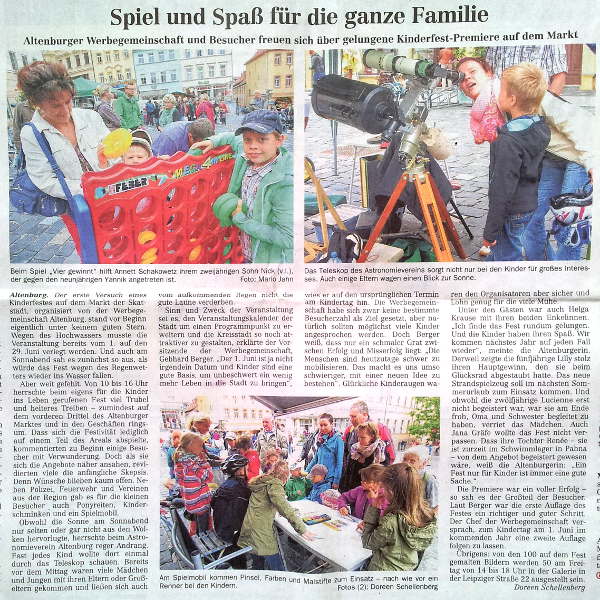 Die Altenburger Werbegemeinschaft hatte Vereine eingeladen, ihr 1. Kinderfest auf dem Markt mitzugestalten. Ein erster Versuch am 1. Juni war wegen eines bevorstehenden Unwetters abgesagt worden. Für den zweiten Versuch am 29. Juni war auch Regen angesagt, aber keine Katastrophe mit Hochwasser. Der Altenburger Astronomieverein Bernhard Schmidt e.V. war dabei.