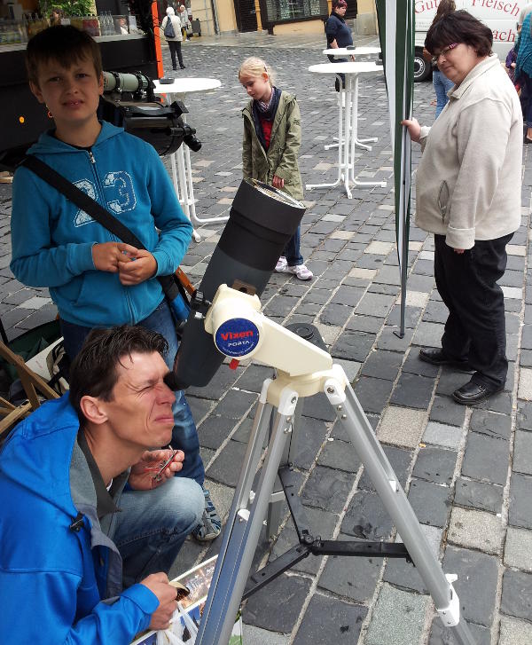 Die Osterländer Volkszeitung berichtete am folgenden Montag (1.7.) mit Bildern von Mario Jahn und Text von Doreen Schellenberg: "Obwohl die Sonne am Sonnabend nur selten oder gar nicht aus den Wolken hervorlugte, herrschte beim Astronomieverein Altenburg reger Andrang. Fast jedes Kind wollte dort einmal durch das Teleskop schauen."