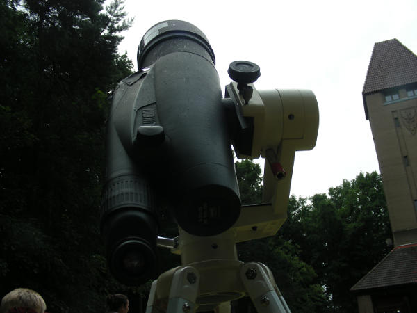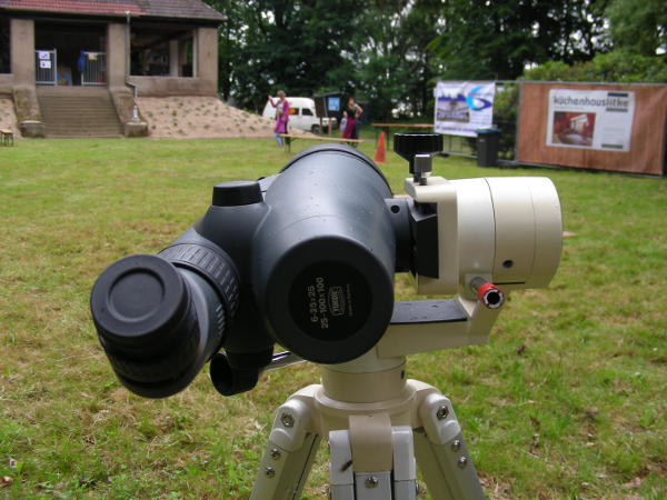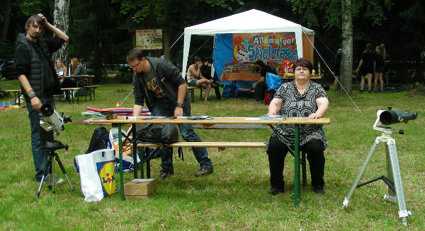 Gegen 10:45 war alles fast fertig aufgebaut. Nur auf dem Tisch wurde noch etwas aufgeräumt. Die beiden Fernrohre sind nicht mit Filtern versehen. Die Wettervorhersage hatte Regen, Gewitter und nur sehr wenig Sonne angekündigt. So war anfangs auch nichts von der Sonne zu sehen. Die Fernrohre wurden auf irdische Objekte ausgerichtet.