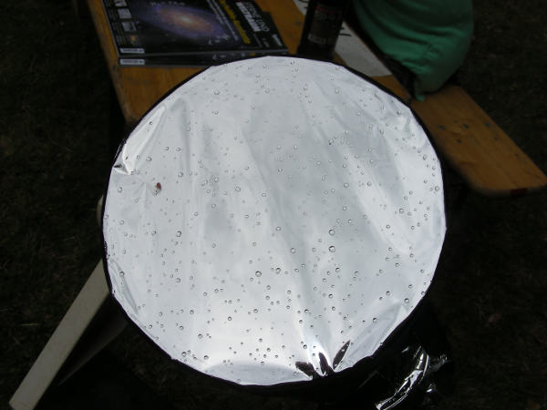 und an den Tuben. Als es auf 15 Uhr zu ging, wurde der Regen kräftig und beschädigte vieles aus Papier und Pappe. Schließlich musste die Beobachtung abgebrochen werden.