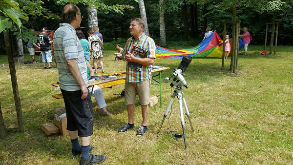 Winfried (r.), in den 80ern Mitglied der Kulturbund-Fachgruppe Astronomie, hatte ab den 90ern wegen Montagetätigkeit keine Möglichkeit, das Hobby weiter zu betreiben. Im Ruhestand wird es wieder möglich sein.