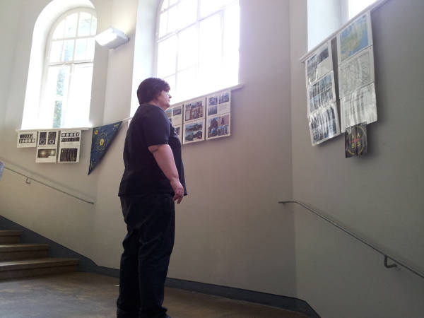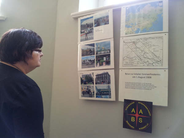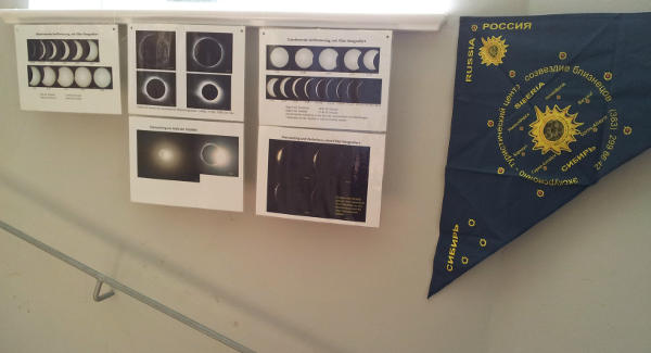 Wer vom Erdgeschoss die Treppe hochsteigt, sieht zunächst einleitende Informationen, eine Karte mit der Lgae des Beobachtungsortes, dem Verlauf der Totalitätszone und Fotos von der Ankunft in Novosibirsk.