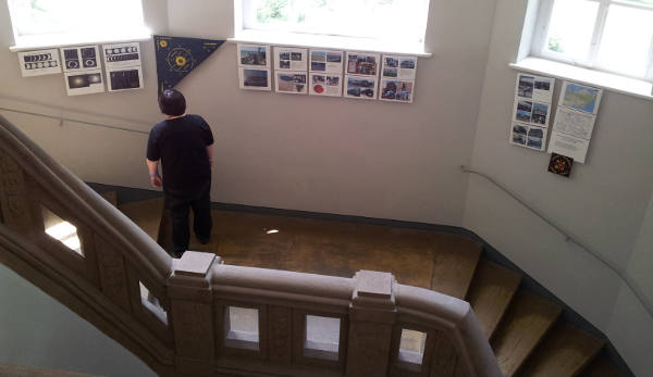 Die Treppenhausaustellung endet mit Bilder von der Sonnenfinsternis vom 1.August und wenige Schritte weiter ist die Ausstellung des Mauritianum in der ersten Etage erreicht.