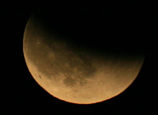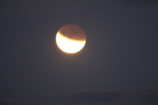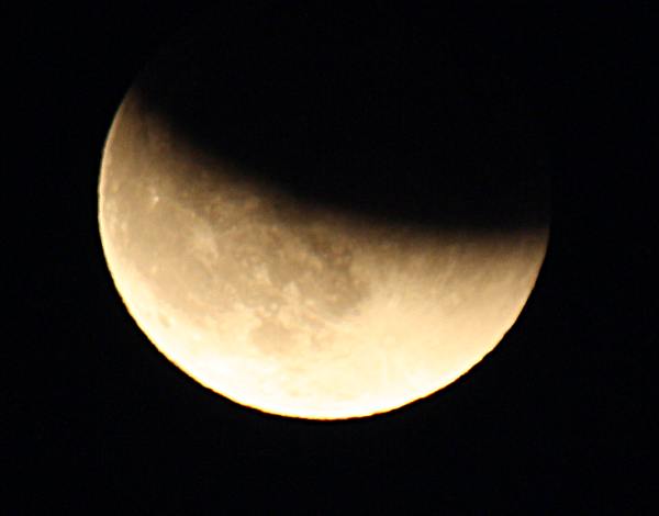 16:43 Uhr: Bei einer Belichtungszeit von 1 s ist der verfinsterte Teil gut im rötlichen Licht zu sehen, das die Erdatmoshäre auf den dorthin ablenkt.