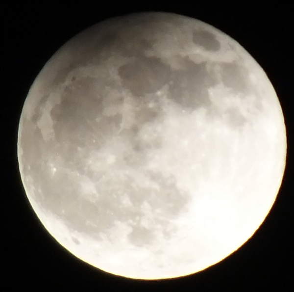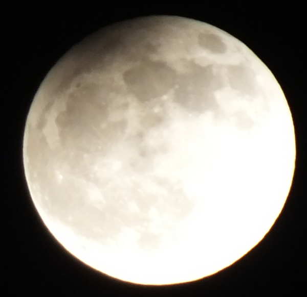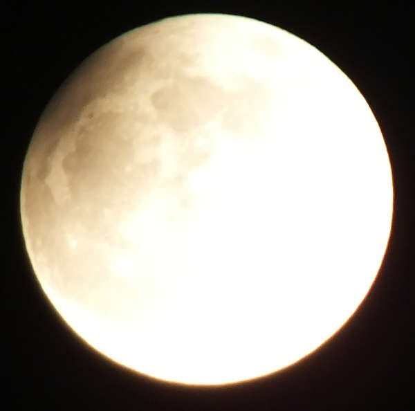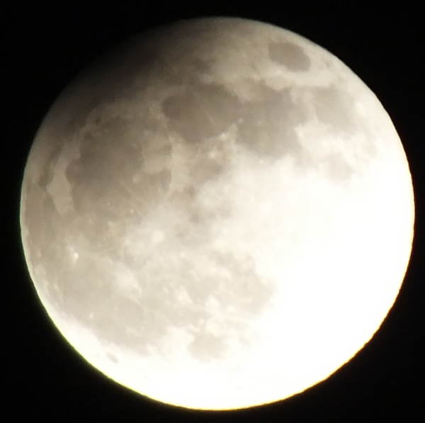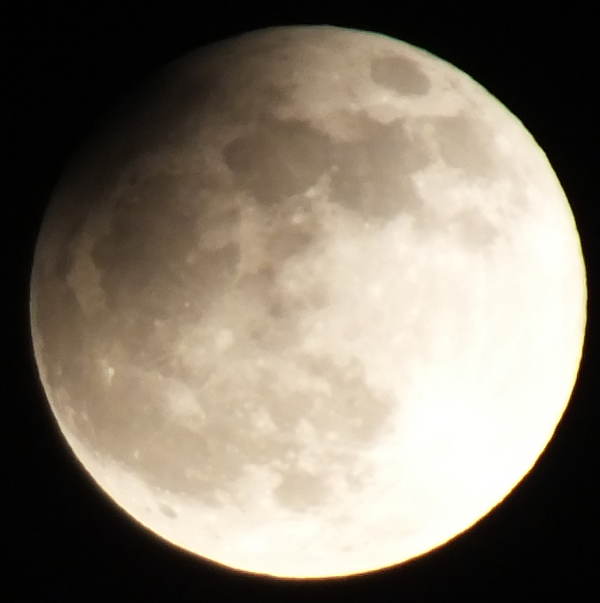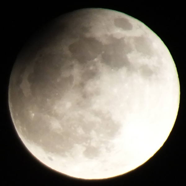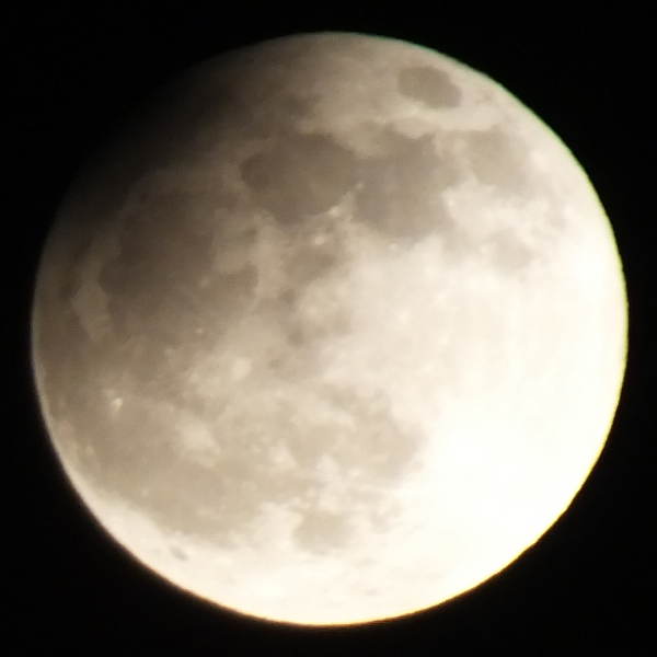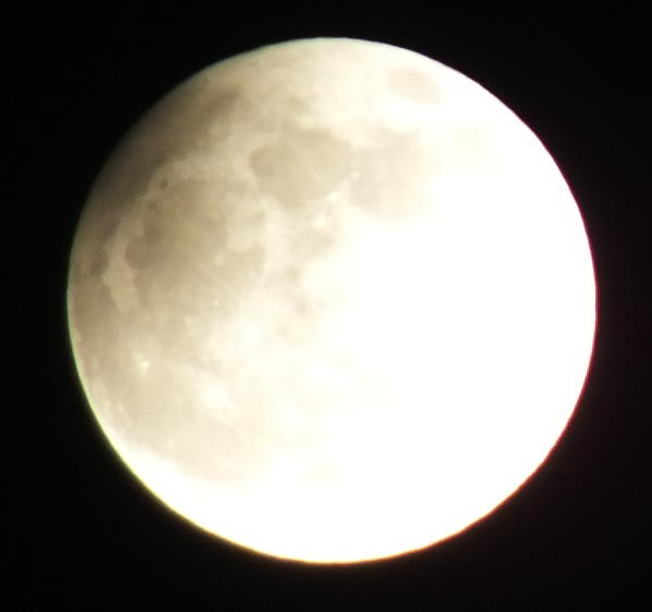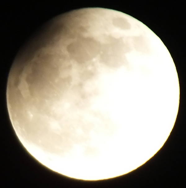Diese Handyaufnahme am Okular ist mein bestes Foto von dieser Mondfinsternis. Hier passiert gerade der dritte Kontakt. Wegen der diffusen Schattengrenze ist das nicht zu erkennen. Die Unschärfe entsteht hauptsächlich durch Lichtstreuung in der Erdatmosphäre.