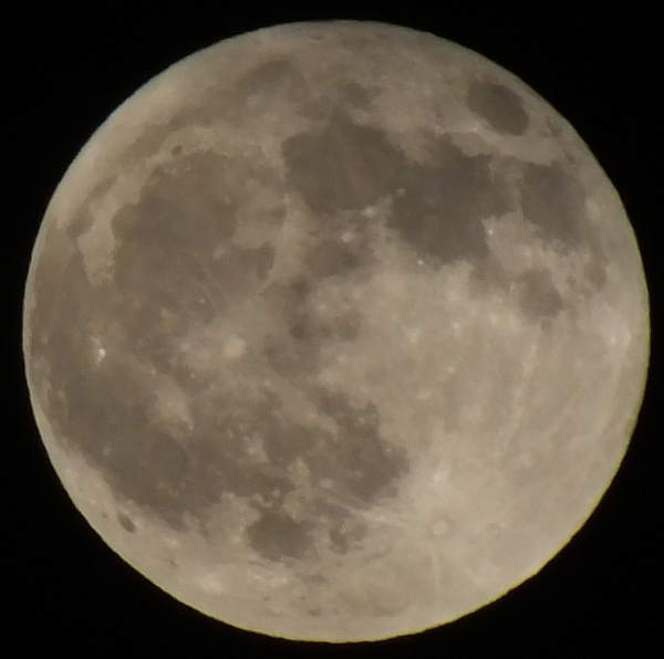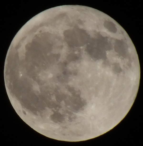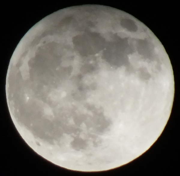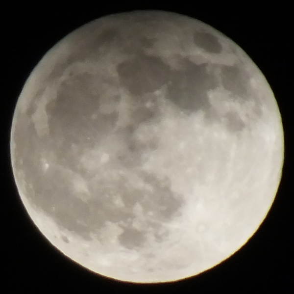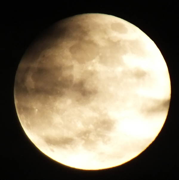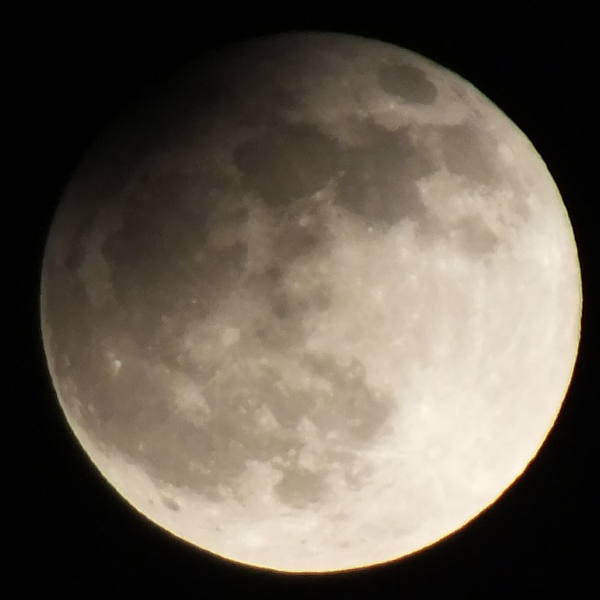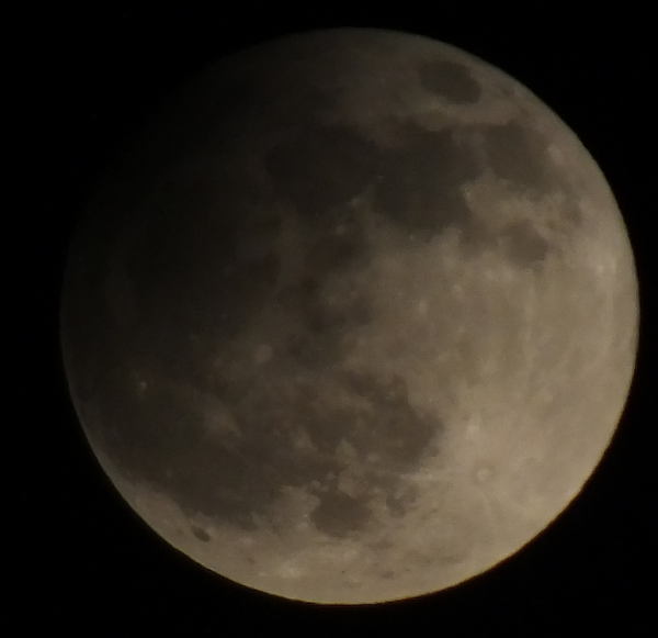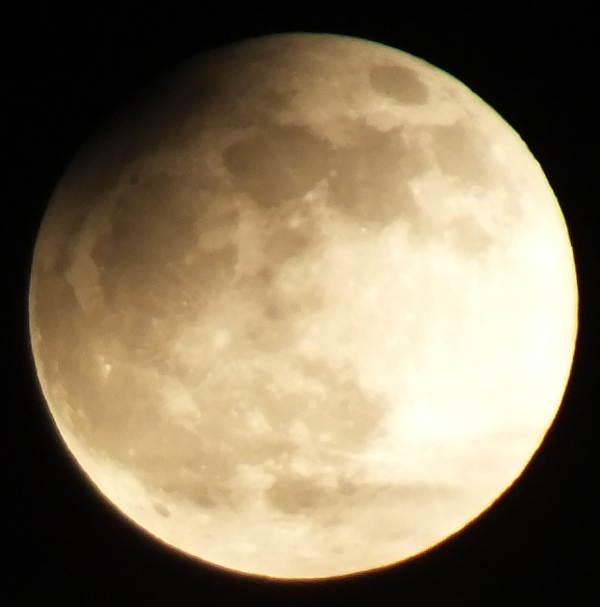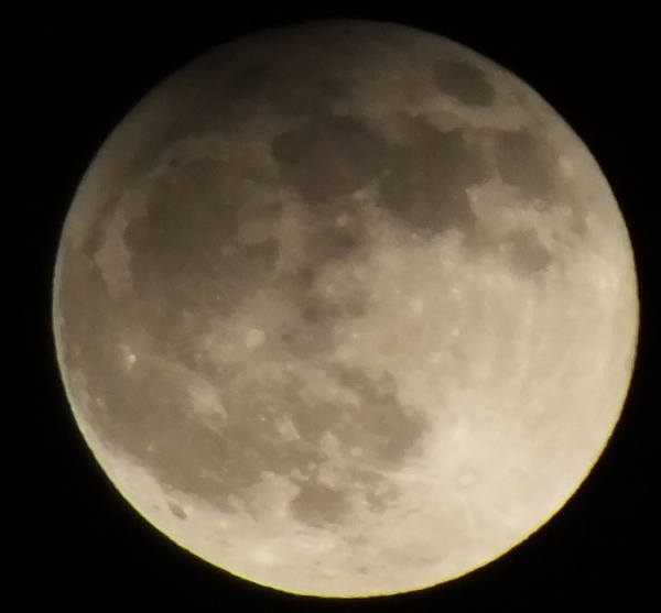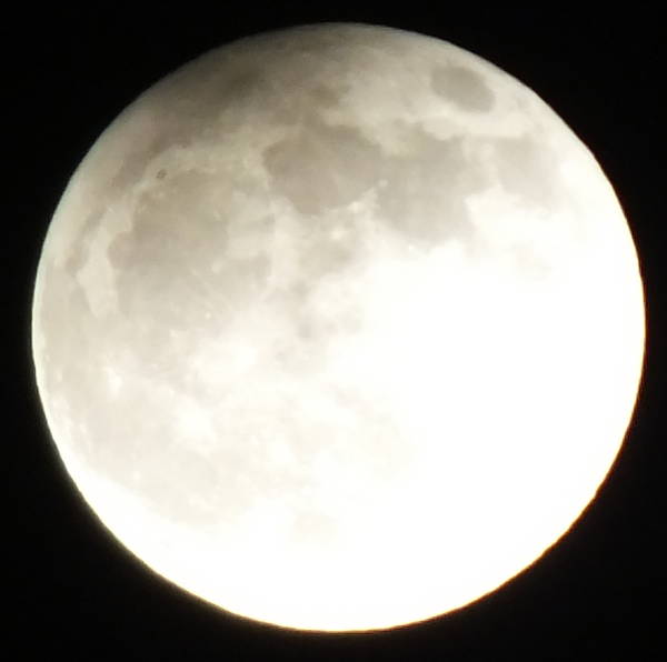 Diese Handyaufnahme am Okular ist mein bestes Foto von dieser Mondfinsternis. Hier passiert gerade der dritte Kontakt. Wegen der diffusen Schattengrenze ist das nicht zu erkennen. Die Unschärfe entsteht hauptsächlich durch Lichtstreuung in der Erdatmosphäre.