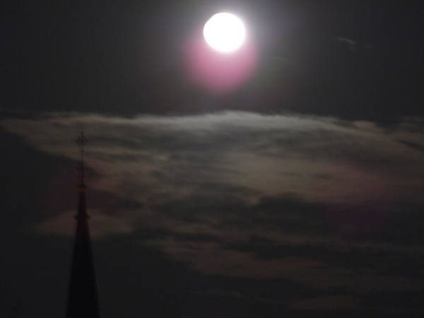 Auf der überbelichteten Aufnahme sind Kirchturm und Wolkenschicht zu sehen. Inzwischen ist der Mond in den Kernschatten eingetreten, was trotz Überbelichtung zu sehen ist.