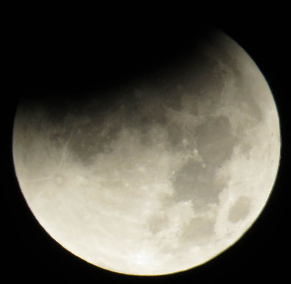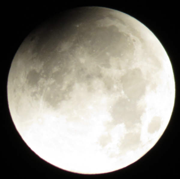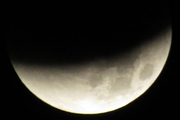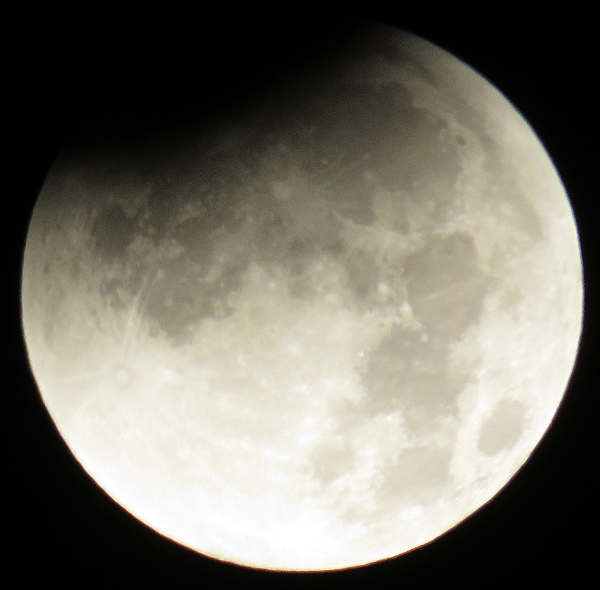 3:02 - Die partielle Phase hat noch nicht begonnen. Trotzdem ist die Verfinsterung durch den Halbschatten schon zu sehen. Vom Mond aus gesehen ist an den verdunkelten Stellen partielle Sonnenfinsternis.