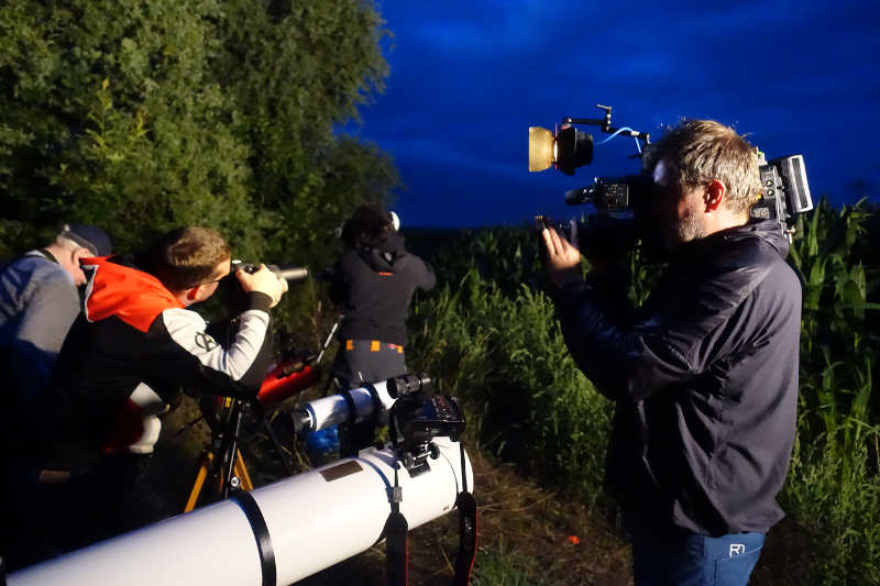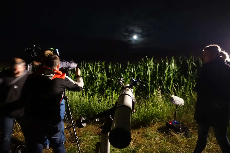 Die Beobachtung wurde von einem Fernsehteam des mdr begleitet, das Aufzeichnungen für das Thüringen Journal des Folgetages machte. Zu Beginn war es bewölkt und wir mussten uns gedulden, bis sich der Mond zeigte. Bald zeigten Sterne an, dass ich von Norden eine große Wolkenlücke näherte.