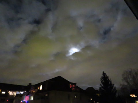 Später zogen hin und wieder Felder mit kleinen Wolkenlücken durch. Das machte Hoffnung, doch noch einen glücklichen Blick zu erwischen. Die eigentümliche Gelbfärbung mancher Wolken entstand durch die Beleuchtung der Red Bull Arena.