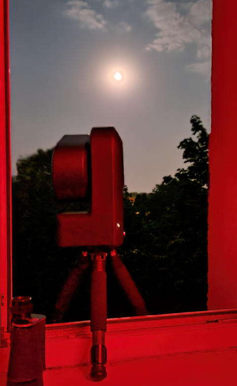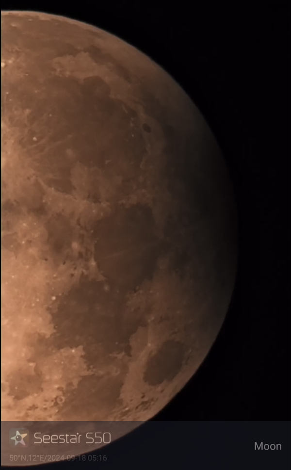 Das Wetter im September 2024 zeigte sehr wechselhaft. Am Morgen des 18.9. war es dunstig, aber der Mond war gut zu sehen. Für das bloße Auge war er nicht so blendend hell wie üblich und man konnte die Mare gut erkennen. Die fotografische Dokumentation erfolgte an einem Südfenster der Wohnung von Frank Vohla mit einem Seestar S50. Dieses selbst beobachtende Fernrohr macht die Arbeit leicht. Weil bei der Aufstellung auf der Fensterbank die automatische Ausrichtung nicht funktionierte, musste der Mond manuell eingestellt werden. Danach hielt die Nachführung den Mond trotzdem einigermaßen im Blickfeld, so dass nur von Zeit zu Zeit Korrekturen nötig waren.