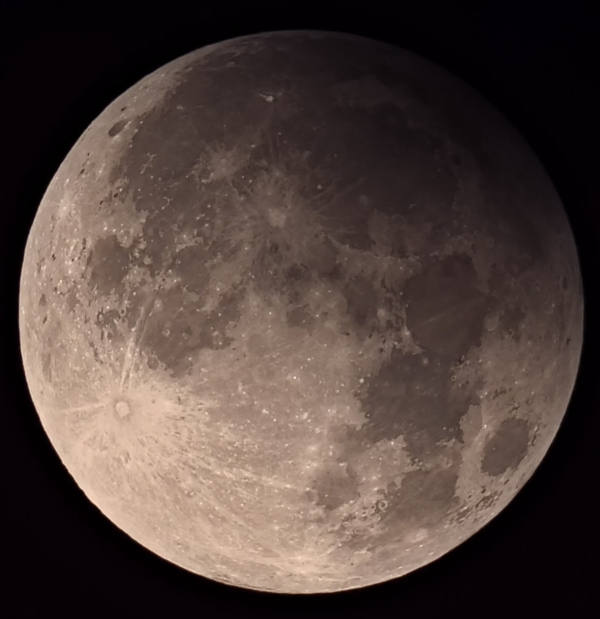 Wieder Automatikbelichtung: Bei Vollmond sind mangels Schattenwürfen die Krater schlecht zu erkennen. Eine Ausnahme ist der nun sehr dominante Tycho.