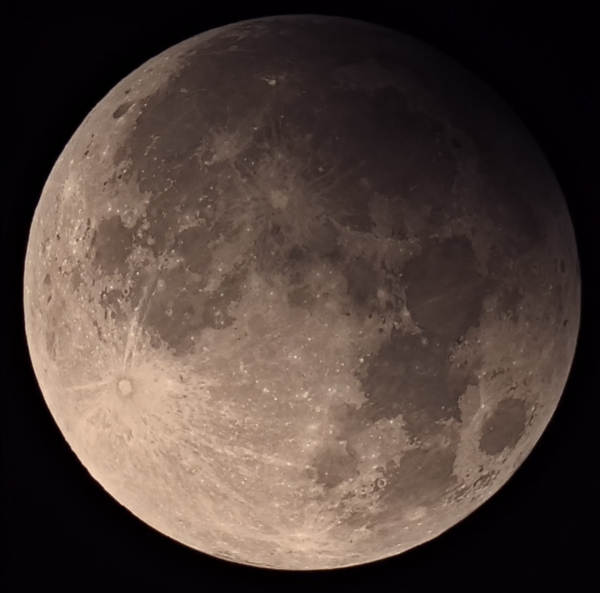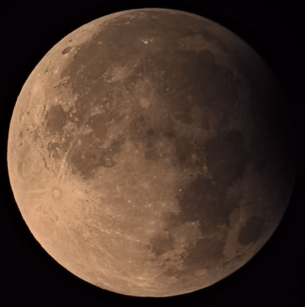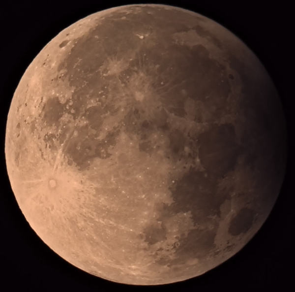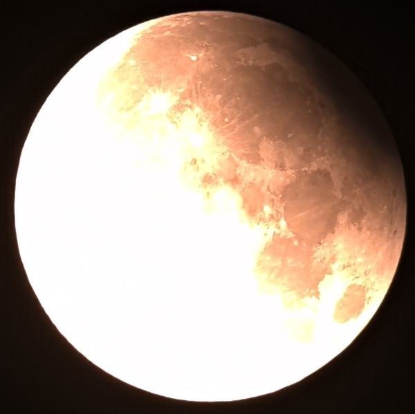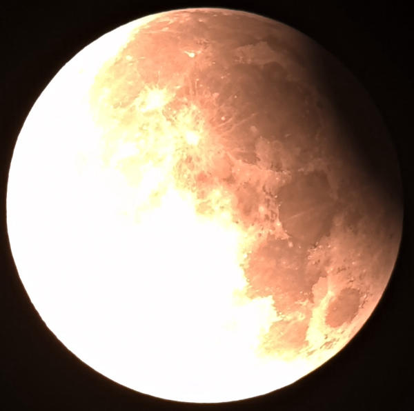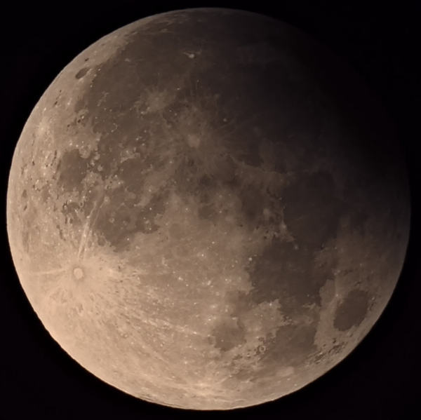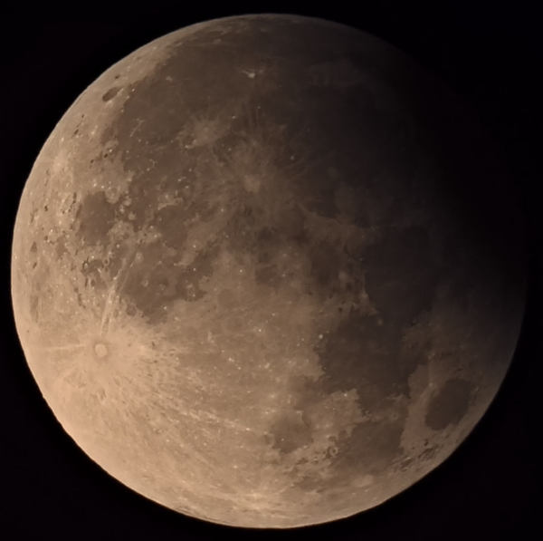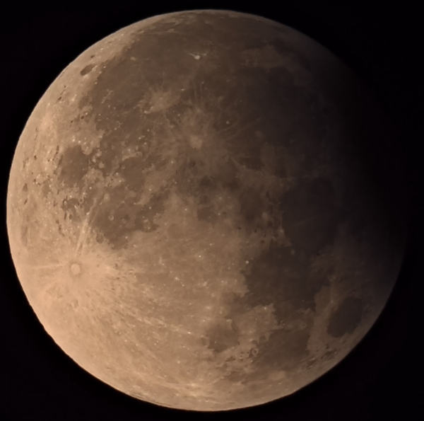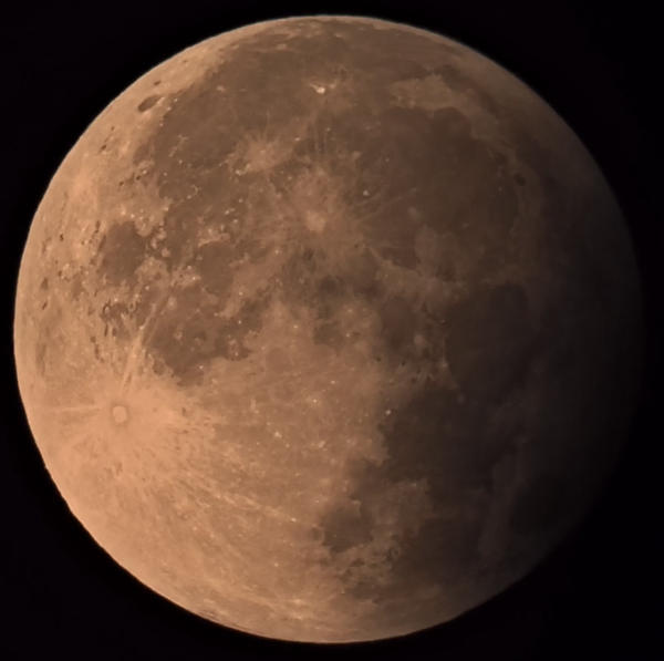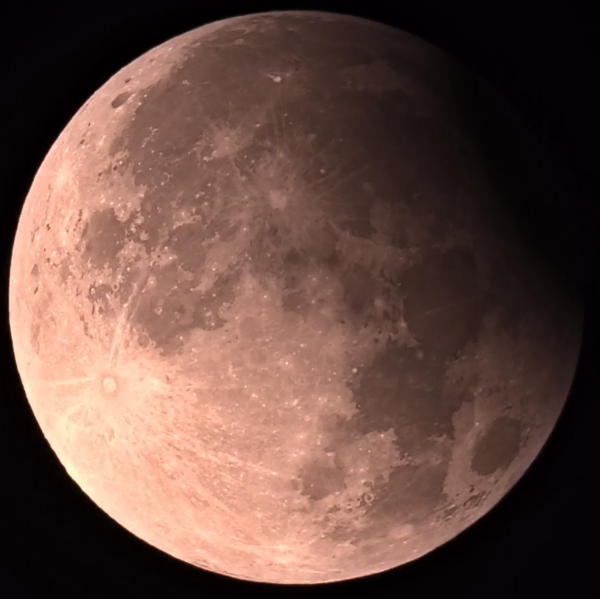 Auf einer länger belichteten Aufnahme ist der verfinsterte Teil schärfer abgegrenzt. Dem schließt sich ein rötlicher Teil im Halbschatten an. Das ist Sonnenuntergangslicht, das von der Erdatmosphäre zum Mond gebrochen wird.