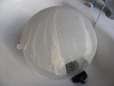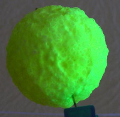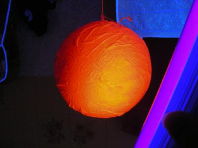 Größere Kugeln bekommt man leicht floureszierend, wenn man sie mit nassem Papier von der Küchenrolle belegt und danach mit fluoreszierender Plakatfarbe bemalt. Die Papierhülle hält ohne Leim.