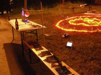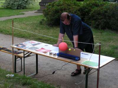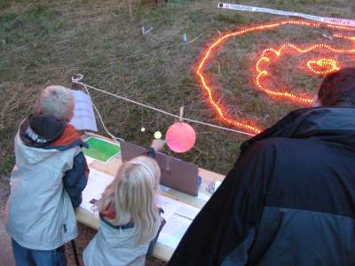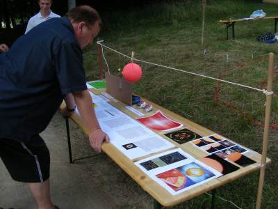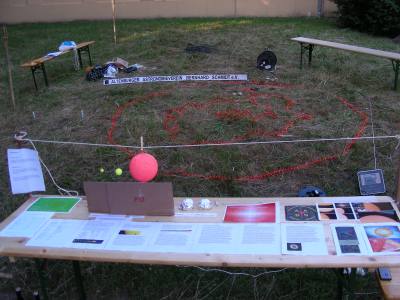 Auf dem Tisch befanden sich Beschreibungen der Sonnenentwicklung und der Modelle. Auch Kugeln, die die kleineren Entwicklungsphasen (Hauptreihe, Heliumbrennen) im Maßstab 1 : 8 x 1010 ( 1 cm entspricht 800.000 km im All) darstellten, fanden dort Platz. Eine UV-Leuchte sollte sie später zum Fluoreszieren bringen. Mit dieser Technik hatten wir bei den Museumsnächten 2004 und 2005 Erfahrungen gesammelt.