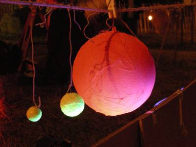 Im Dunkeln wurden ein Kreis aus LEDs sichtbar, der die Venusbahn im Bauch des Roten Riesen markierte. Das Knicklicht links stellt die Erde dar. Sie wird wahrscheinlich erst spät durch Gezeitenkräfte zum Absturz gebracht.