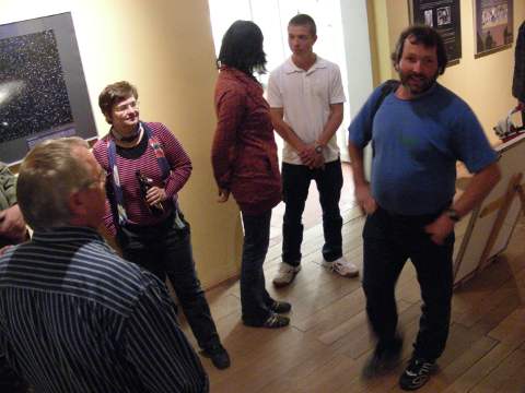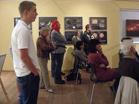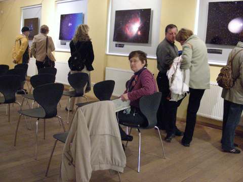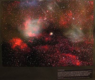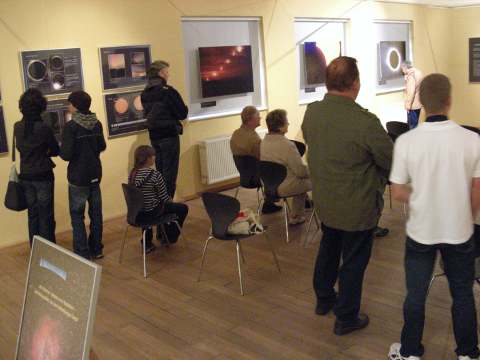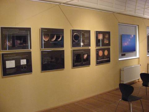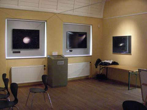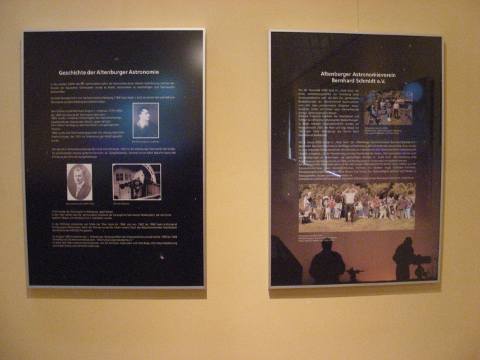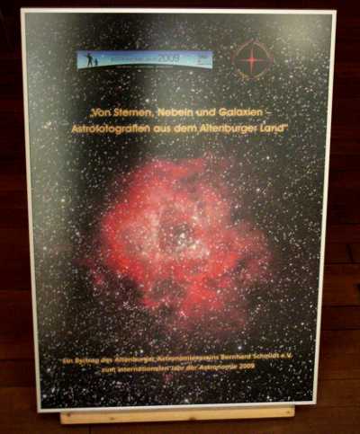 Die Ausstellung befindet sich im Vortragsraum im Südflügel im 1. Stock. Die Eröffnung fand am 6.6.09 zur X. Altenburger Museumsnacht statt. Wie schon erwähnt und auch auf dem Aufsteller am Eingang zu erkennen, ist sie ein Beitrag zum Internationalen Astronomischen Jahr 2009. Das Hintergrundbild ist eine Aufnahme des Rosettennebels von Thomas Fischer.