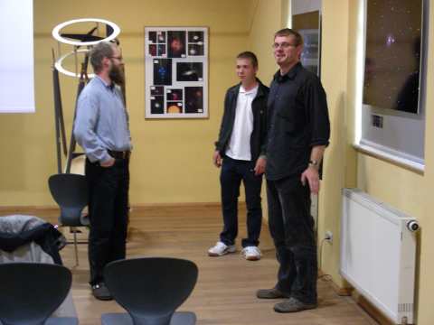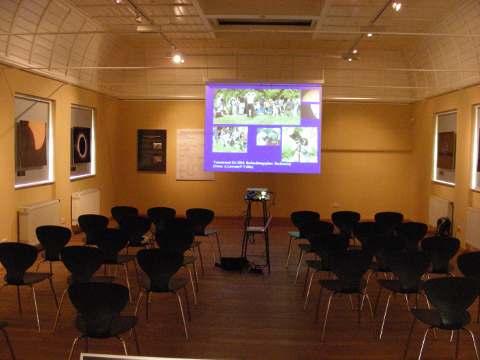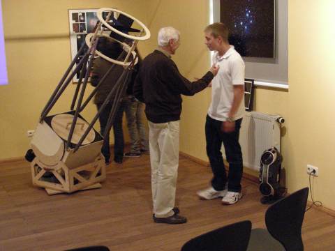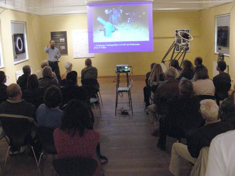 Auf der Leinwand lief während der Museumsnacht eine Präsentation mit Aufnahmen aus der Geschichte des Altenburger Astronomieverein Bernhard Schmidt, seiner Vorgängerorganisationen seit 1982. Die Wand dahinter war zum Zeitpunkt der Aufnahme noch unvollständig bestückt. Hier geht es um den 16"-Dobson von Thomas Fischer. Mit dem Eigenbau dieses Fernrohrs gewann Thomas beim 15. Regionalwettbewerb Ostthüringen von "Jugend forscht" den 1. Preis im Fachgebiet Geo- und Raumwissenschaften, sowie den Sonderpreis der Gewerkschaft Erziehung und Wissenschaft (GEW). Vor der leeren Fläche rechts neben der Leinwand wurde während der Museumsnacht das Spiegelteleskop aufgebaut.