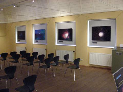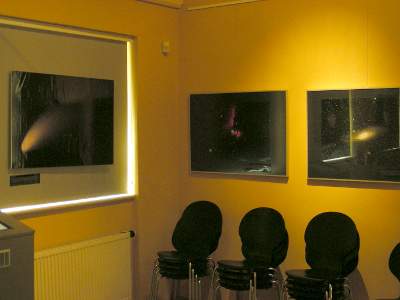 Auf der parkseitigen Wand sind dann vier Bilder von Thomas Fischer zu sehen, die Plejaden (M45), die Whirlpool-Galaxie (M51), der Orionnebel (M42/43) und der Komet Holmes aus dem Jahre 2007 (v.l.n.r.).