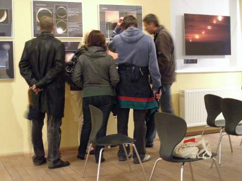 Auf den letzten beiden Bilder an der Ostwand ist die Sonnenfinsternis vom 1.8.2008 abgebildet. Das linke Bild nahm Thomas Fischer von Zschaschelwitz aus auf. Weil er ein Fernrohr mit einem Hα-Filter verwendete, sind trotz parteiller Phase Protuberanzen zu sehen. Das andere Bild entstand im Totaltätsstreifen am Ob-Stausee bei Bersk, nahe Nowosibirsk (Frank Vohla).