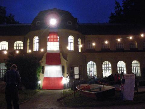 Zur Museumsnacht hatte das Mauritianum das Motto: "Von funkelnden Sternen und blitzenden Zähnen". Letzteres bezog sich auf die Hai-Ausstellung im Erdgeschoss. Passend dazu war der Außenbereich mit Leuchtturm, Strand und Ruderboot dekoriert.