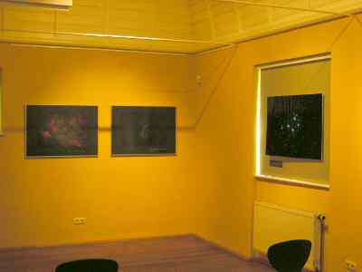 An der straßenseitigen Wand geht es weiter mit den Themen Lichtverschmutzung und Veränderliche Sterne. Auf den nächsten beiden Aufnahmen sind die Mondfinsternis vom 9.1.2001 (Andreas Lawrenz) und die Venusbedeckung durch den Mond vom 18.6.2007 (Frank Vohla) zu sehen. Weiter geht es mit den totalen Sonnenfinsternissen von 1999, 2006 und 2008 (Andreas Lawrenz und Frank Vohla). Die letzten beiden Rahmen vor dem Fenster zeigt Aufnahmen der Polarlichter vom 20.11.2003, die vom Altenburger Land aus gut gut sehen waren (Jürgen Sauermann und Frank Vohla). Darunter sind Plantentransits (Durchgänge vor der Sonne) zu sehen. Die beiden großen Aufnahmen des Merkurtransits vom 7.5.2003 und des Venustransits vom 8.6.2004 stammen von Andreas Lawrenz und der Bilderstreifen darunter aus einer Webcam-Videosequenz (Frank Vohla). Schließlich ist im verhangenen Fenster eine mehrfach belichtete Aufnahme der Sonnenfinsternis vom 31.5.2003 von Andreas Lawrenz zu sehen. Mit diesem Foto gewann Andreas bei einem Fotowettbewerb der VG Altenburger Land und des Flughafens eine Reise nach London.