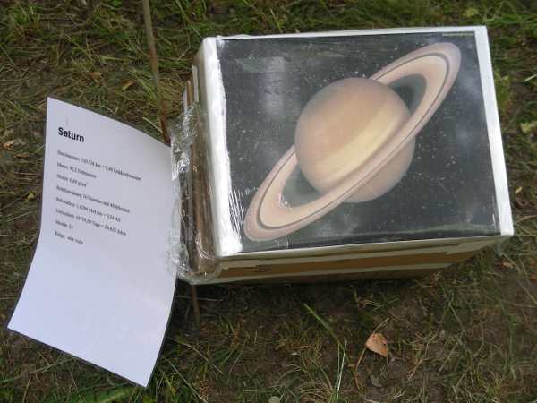 Beim Saturn reichten die A4-Folien wegen dem ausgedehnten Ringsystem nicht aus. So fand ein Tintenstrahldruck auf A3-Papier Verwendung, der mit Folie gegen Feuchtigkeit geschützt wurde.