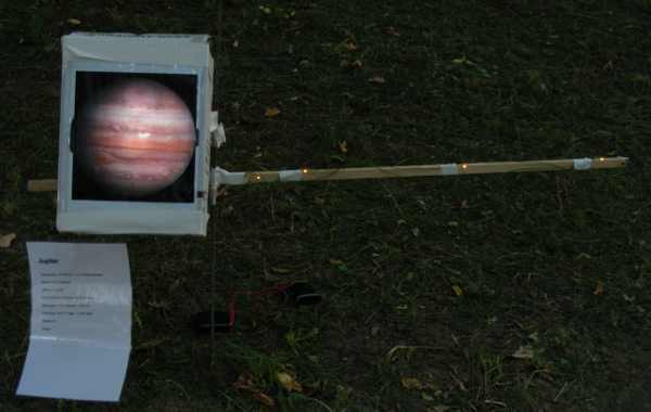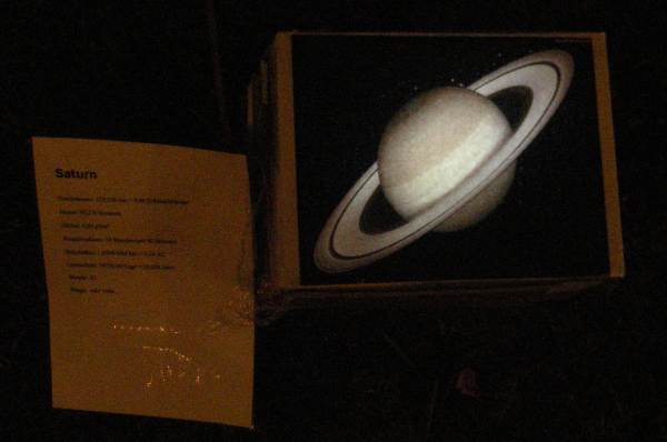 Hier sind die inneren Planeten zu sehen, v.l.n.r Mars, Erde, Venus und Merkur. Wegen der Kurzlebigkeit einer Nacht wurde der Aufwand an Material und Fertigung gering gehalten. Pappkartons geeigneter Größe bildeten die Gehäuse. Die Hintergrundbeleuchtung wurde mit batteriebetriebenen LEDs realisiert.