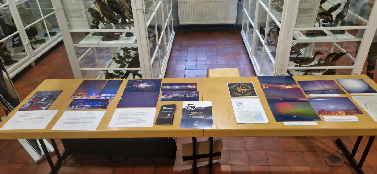 Themen waren Lichtverschmutzung (links) und Polarlichter. Beide sind zur Zeit aktuell. Am 23. April waren in Altenburg Nordlichter zu sehen und das Sonnenmaximum ist noch am Beginn. Die Lichtverschmutzung hat seit dem Auslaufen der Kurzfristenergieversorgungssicherungsmaßnahmenverordnung wieder zugenommen. So stellten auch viele Menschen Fragen zu beiden Themen und nahmen Flyer mit.