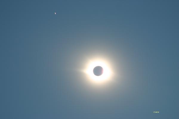 Aufnahme mit 150 mm Brennweite: Der Merkur ist am oberen Bildrand zu sehen. Wegen starkem Wind ist die eine Sekunde belichtete Aufnahme verwackelt. Weil die Totalität endete, blieb keine Zeit mehr, mit dem Bildstabilisator des Objektivs zu experimentieren.