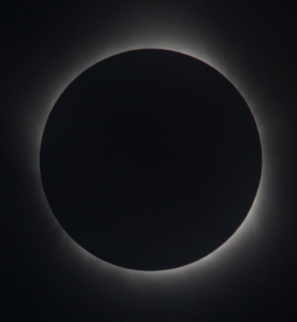 9:37:10; 6 s belichtet: Die längere Belichtungszeit lässt mehr von der Korona erkennen. Sie hat das typische Erscheinungsbild einer Minimumskorona. An den Polen ist sie nur gering ausgedehnt.