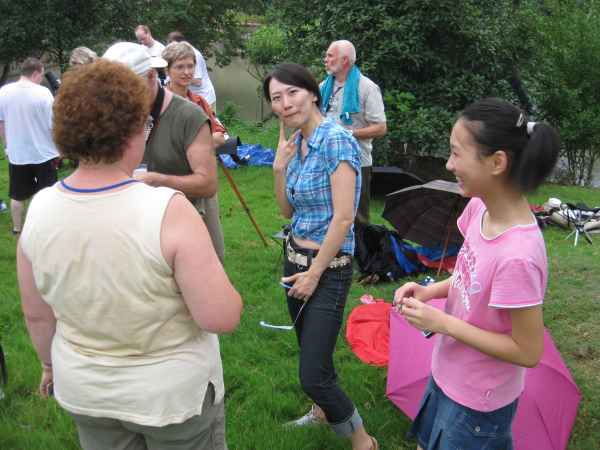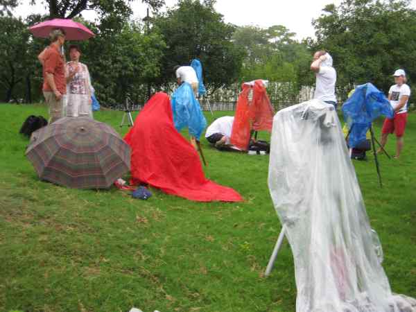 Am Morgen des 22. Juli zeigte sich das Wetter regnerisch. Wir stellten trotzdem unsere Instrumente auf einer Wiese nahe dem Tong An Hotel auf. Die Geräte schützten wir mit Planen vor Regenschauern. Die Regenschauer hielten auch nach dem ersten Kontakt um 8:22 Pekinger Zeit (UT+8h) an. Hoffnung und Sarkasmus mischten sich.