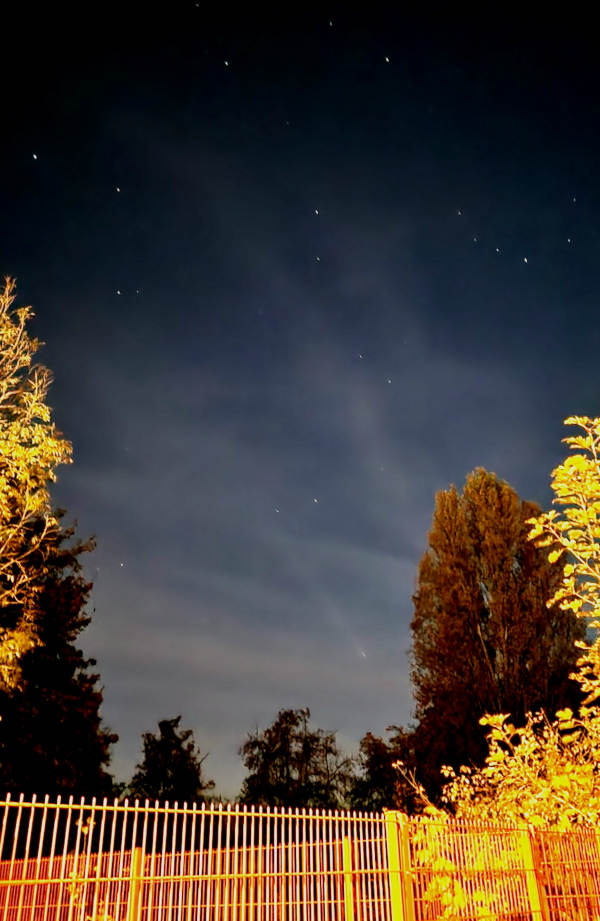 Auf der Südhalbkugel war Tsuchinshan-ATLAS ein beeindruckendes Objekt gewesen. Er erreichte dort -4 mag. Als er im Oktober in unseren Breiten sichtbar wurde, war die Helligkeit schon auf ca. 1 mag abgesunken. Die Morgensichtbarkeit zum Monatsanfang blieb ohne Ergebnisse. Der Wechsel an den westlichen Abendhimmel ab 11.10. war von ungünstigem Wetter gekennzeichnet. Immer war der Westhorizont mit Kondensstreifen zugeschmiert, falls es nicht bewölkt war. Außerdem störte um diese Zeit der Mond sehr. Am 15.10. war der Komet erstmals im Dunst sichtbar und ließ sich mit dem Handy freihändig fotografieren (Samsung S22+, F.Vohla, Standort Feuerwache Altenburg)