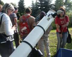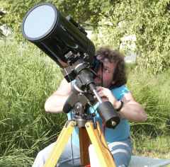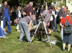 Bei einem Venustransit bewegt sich die Venus auf ihrer Bahn genau zwischen Erde und Sonne durch, schattet ein Stück Sonne ab und verursacht so eine Mini-Sonnenfinsternis. Da die Bahnen von Erde und Venus unterschiedlich geneigt sind, zieht die Venus meist über oder unter der Sonne durch. Nur in sehr seltenen Fällen kommt es zum Venustransit. Am 8.6.2004 war es wieder einmal soweit, nachdem der letzte vom Dezember 1882 soweit zurücklag, dass kein heute lebender Mensch vor dem 8.6. ihn beobachten konnte. Der nächste findet 2012 statt, aber während es in Europa Nacht ist. Danach wird diese seltene Himmelserscheinung über 100 Jahre nicht mehr zu sehen sein. Der Altenburger Astronomieverein Bernhard Schmidt e.V. hatte sich deshalb seit über einem Jahr auf dieses Ereignis vorbereitet. Als Generalprobe diente ein Merkurdurchgang vor der Sonne am 7.5.2003. Dadurch konnten Mängel bei Rechnern und Kameraadaptern beseitigt werden. Am 8.6. spielte das Wetter nach wochenlanger Tristesse mit. Gegen 7 Uhr begannen die Vereinsmitglieder, die Fernrohre auf der Wiese hinter Buchenring 29 aufzubauen. Zwei Teleskope wurden mit Webcams bestückt, um den Venustransit mit dem Computer aufzunehmen. Ein Fernohr diente fotografischen Beobachtungen, drei wurden überwiegend visuell genutzt und um der Bevölkerung schnell die Venus vor der Sonne zeigen zu können, gab es eine Projektionsvorrichtung. Zusätzlich waren zwei Videokameras im Einsatz. Pünktlich 7.19 Uhr begann die Venus, sich vor die Sonne zu schieben. Sie brauchte dann etwas mehr als sechs Stunden, um den Sonnenrand auf der anderen Seite zu erreichen. Während dieser Zeitspanne kamen Schaulustige vorbei, die sich den Venustransit nicht entegehen lassen wollten.