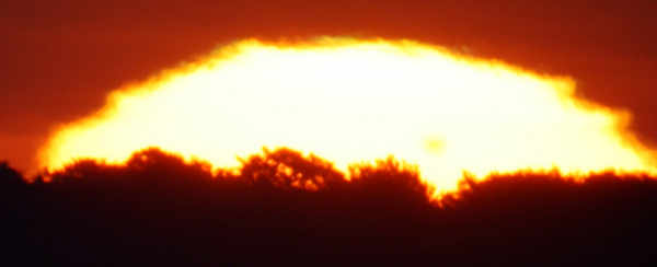 5:03 MESZ: Die Sonne hat sich nun über die fernen Horizontbäume erhoben und taucht in eine Schicht Kondensstreifen ein.