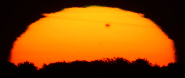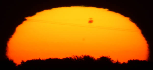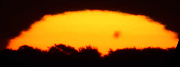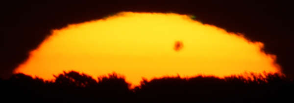 5:02 MESZ: Die Venus ist jetzt kontrastreich zu sehen. Darüber fallen zwei grüne "Hörner" auf. Eine Folge, dass kurzwelliges grünes Licht durch die Atmosphäre stärker nach oben abgelenkt wird, als rotes. Der Hochspannungsmast ist jetzt am unteren Sonnenrand in der Mitte zu sehen.